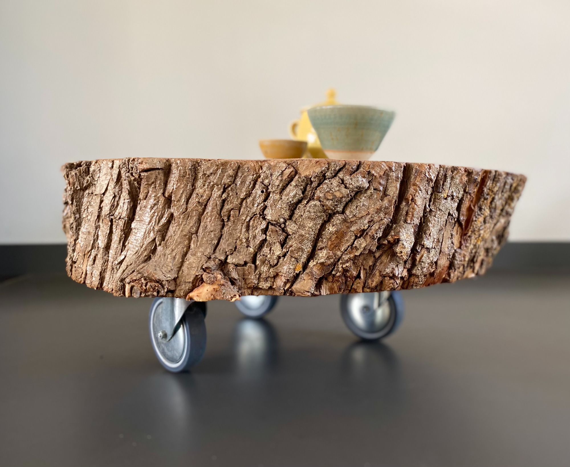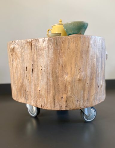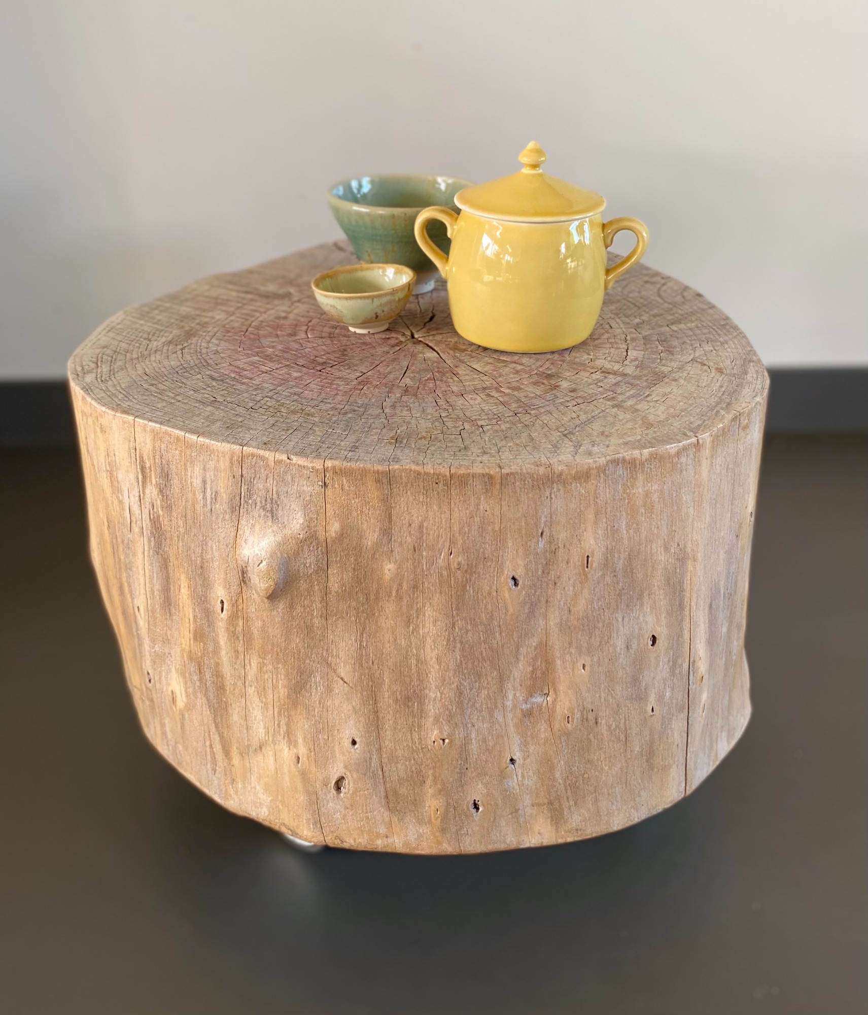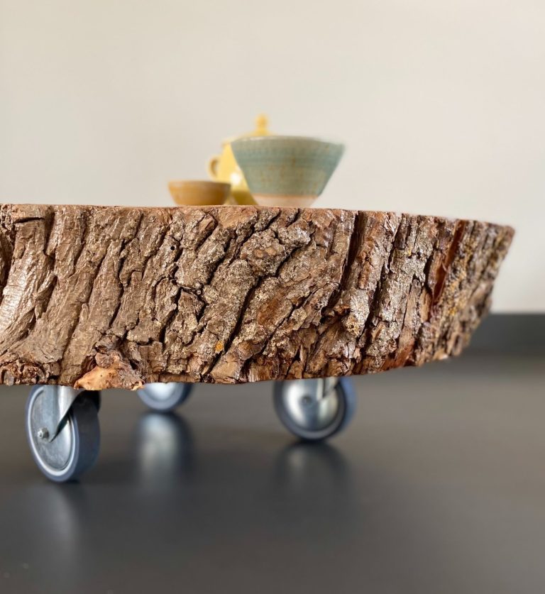 De boomstamtafels maak ik al jaren voor wie dat wil. Wel ben ik afhankelijk van hoveniers die grote bomen moeten kappen en mij wat ‘plakken’ gunnen. Daarna moeten de stammen nog minimaal een jaar drogen. Dus, heb je interesse; ik heb er nog een paar liggen, maar ik kan niet heel snel leveren.